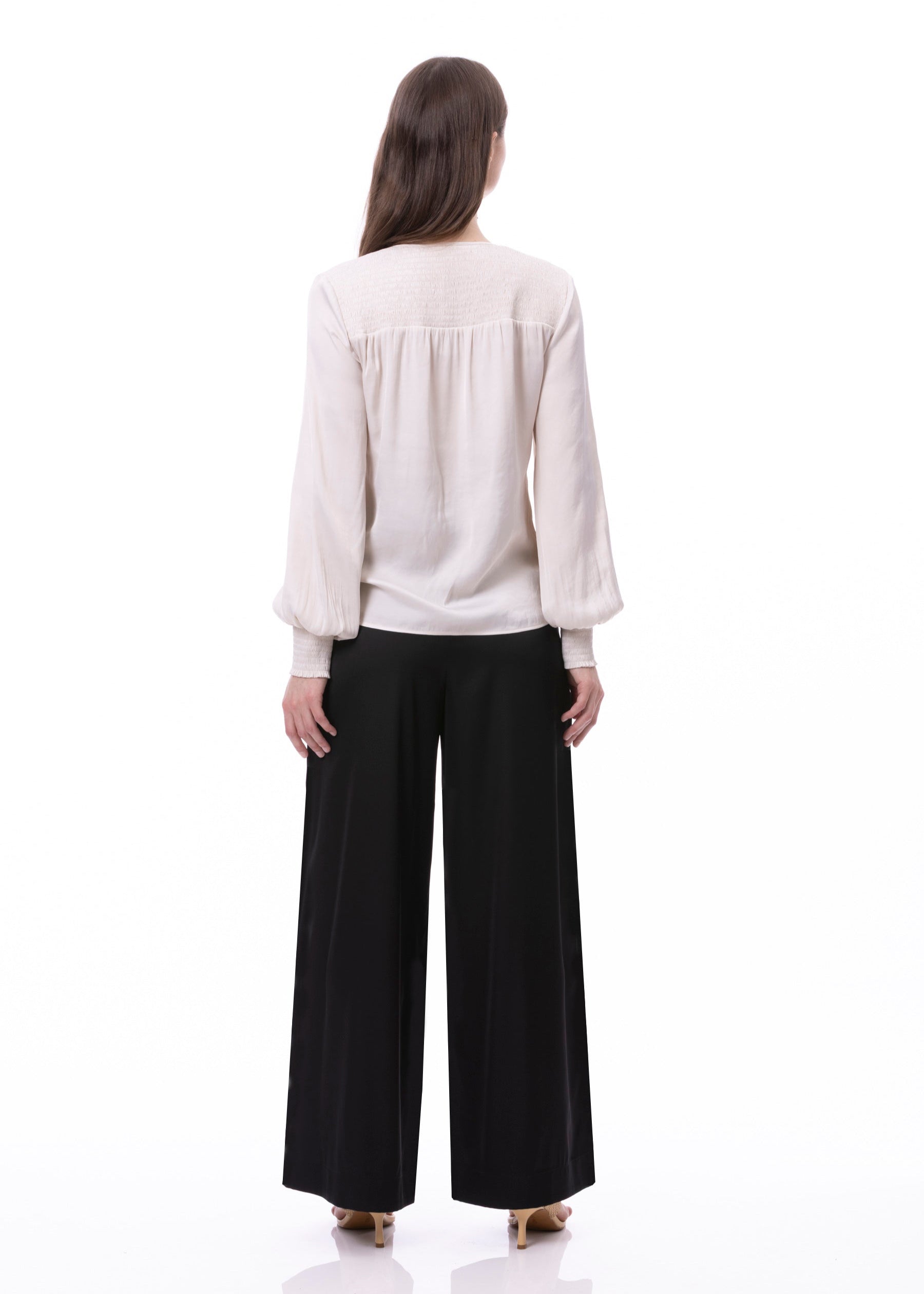 - Smocking details on yokes and cuffs