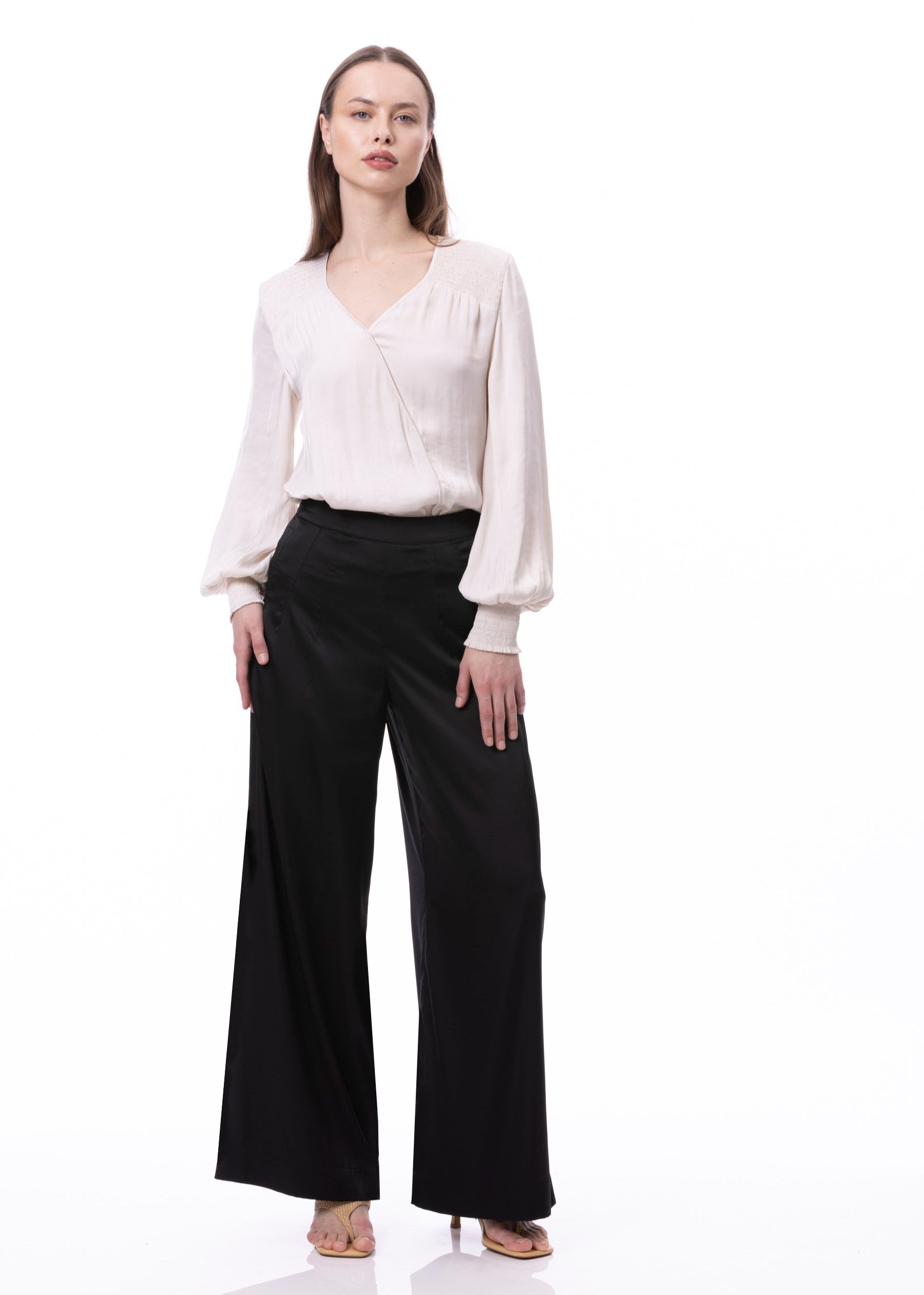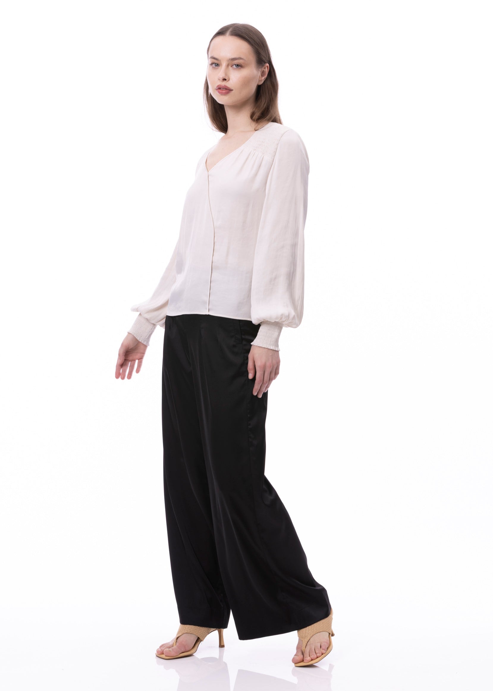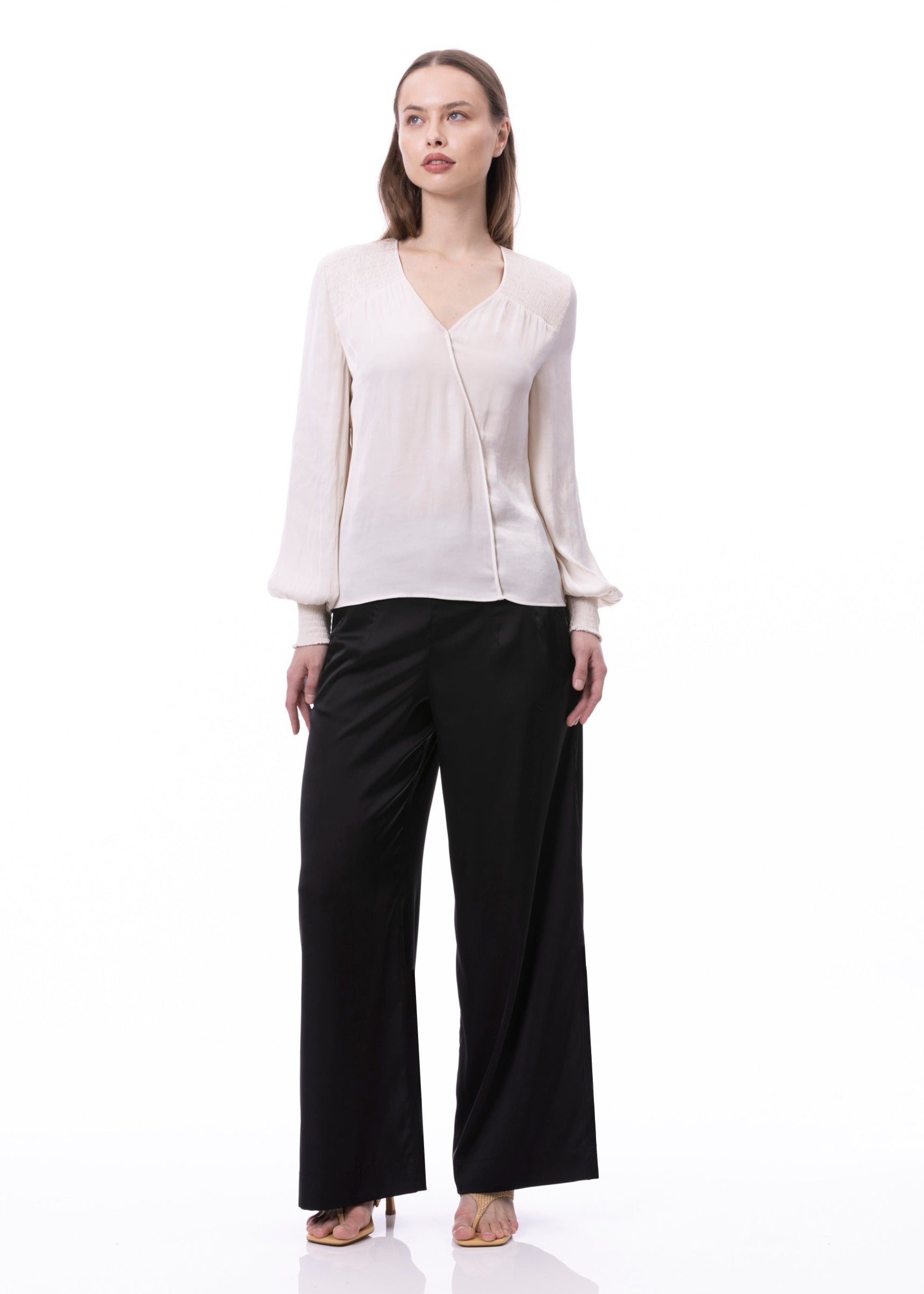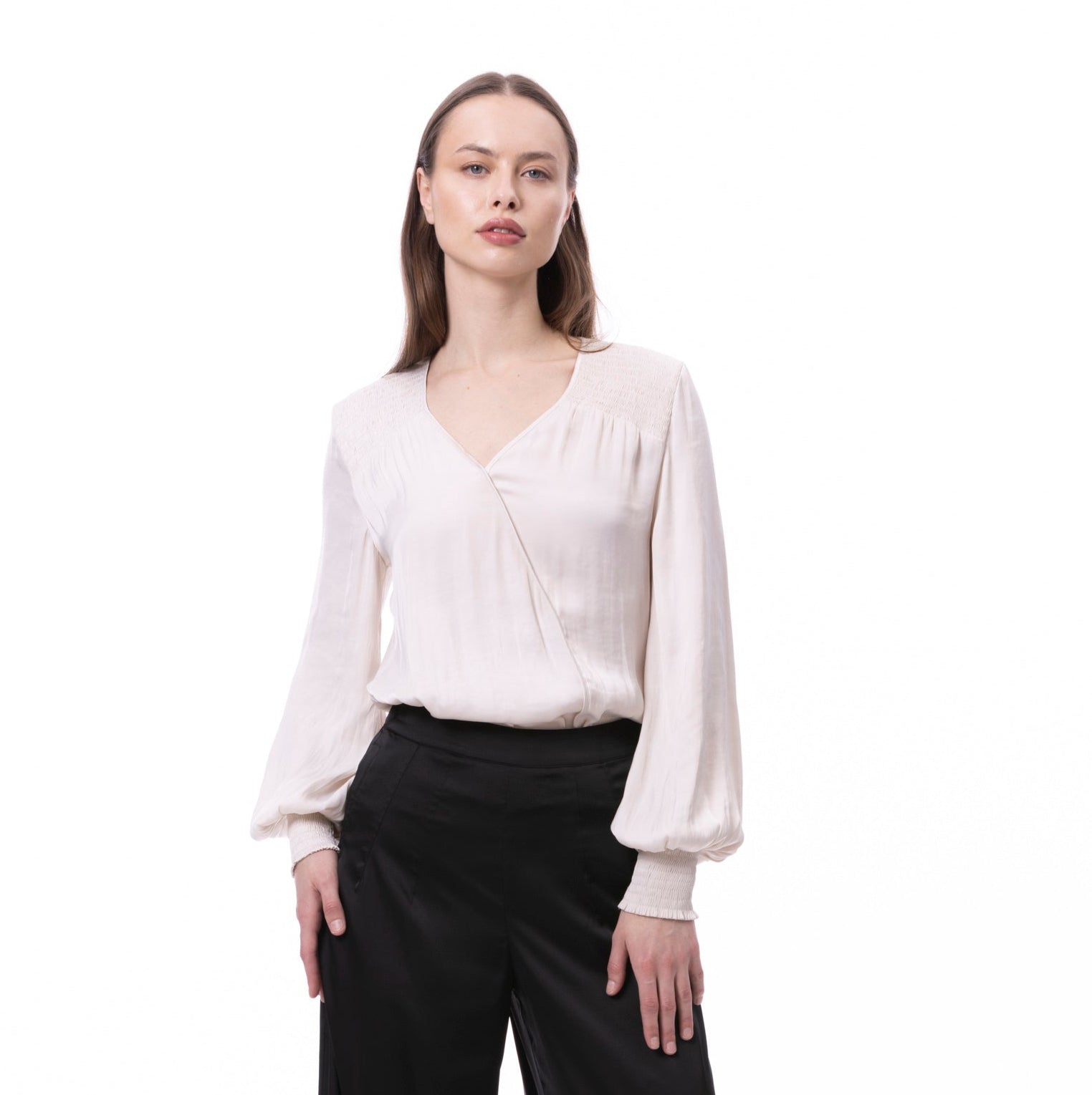 V-neck Bishop Sleeve Smocked Shoulder & Cuff Faux Wrap Blouse In Khaki Solid
