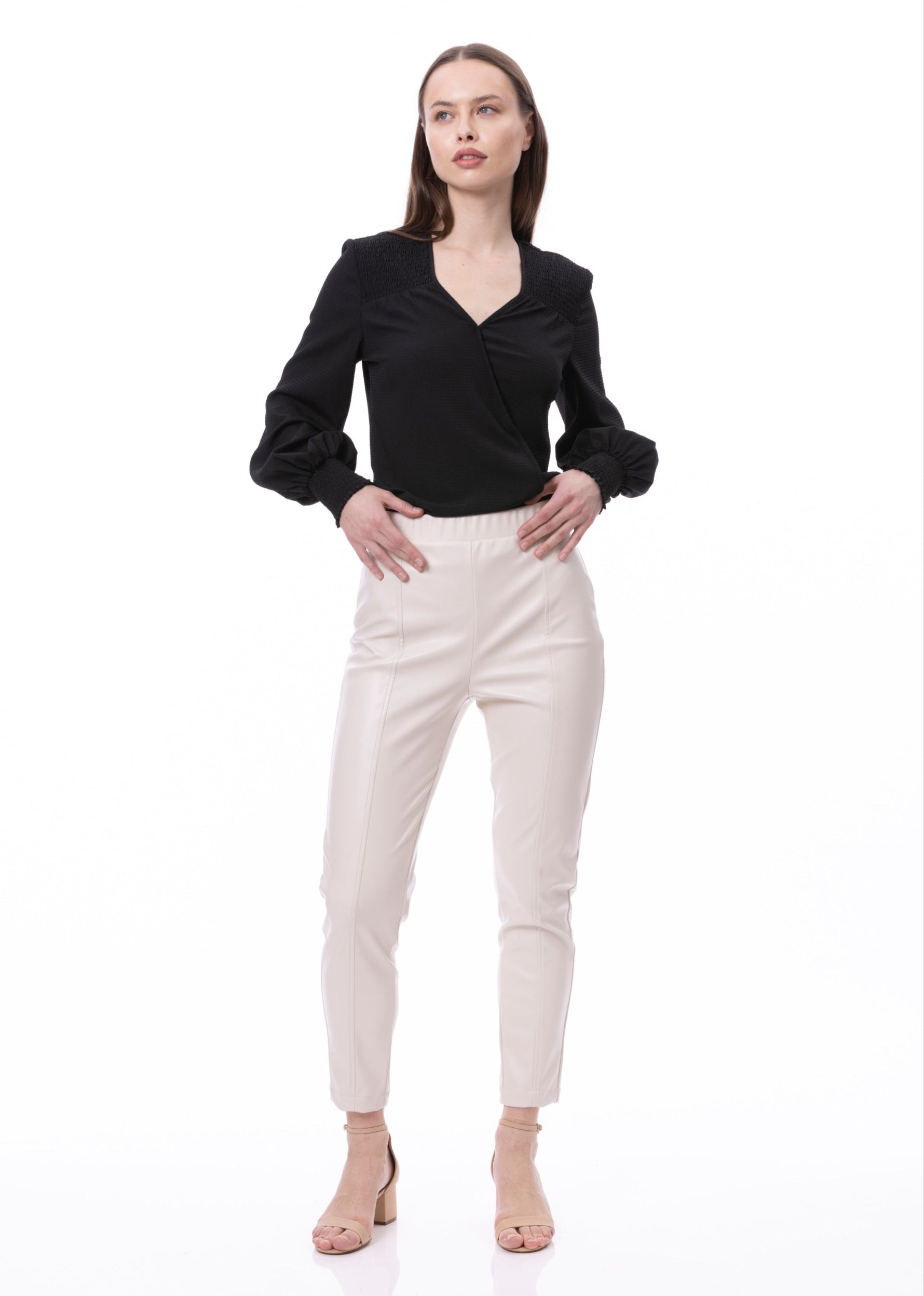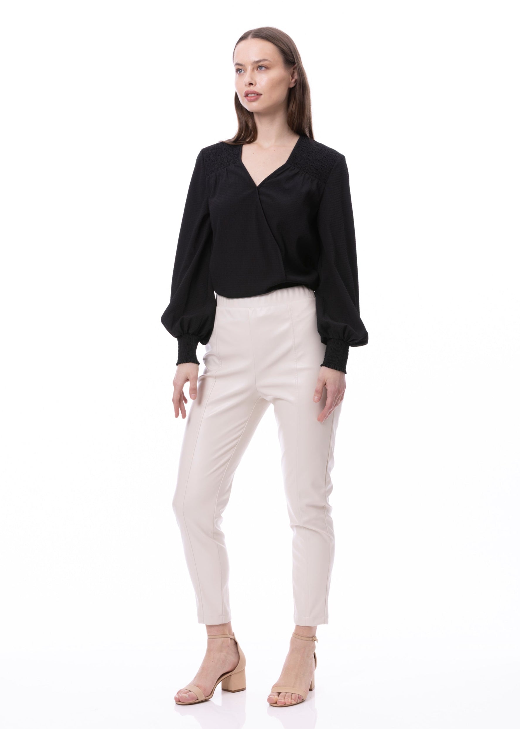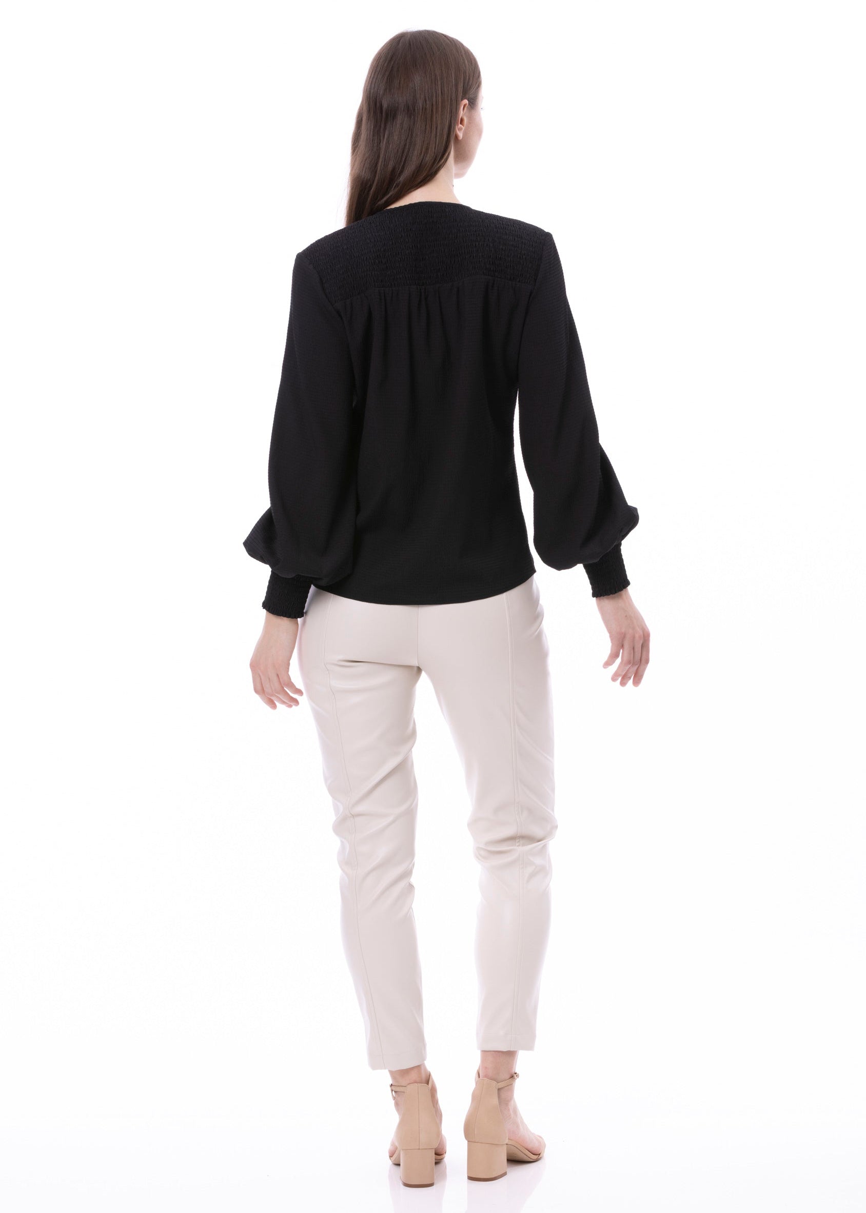 V-neck Bishop Sleeve Smocked Shoulder & Cuff Faux Wrap Blouse In Black Solid